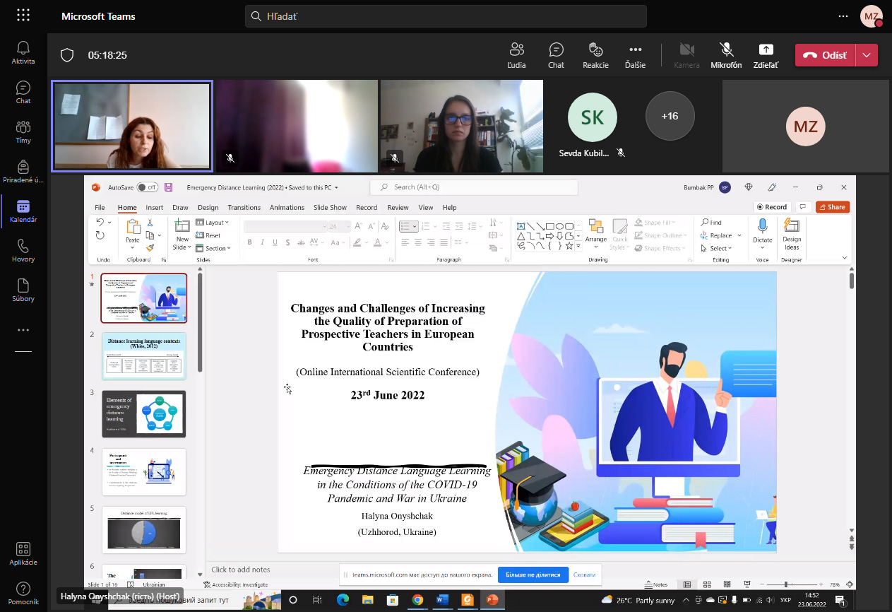 Dňa 23. 6. 2022 sa prostredníctvom platformy MS Teams uskutočnila online medzinárodná konferencia na tému Changes and Challenges of Increasing the Quality of Preparation of Prospective Teachers in European Countries. Okrem riešiteľov projektu a kolegov zo slovenských univerzít vystúpili na konferencii aj vysokoškolskí pedagógovia z európskych krajín, ako napr. Portugalsko, Turecko alebo Ukrajina.